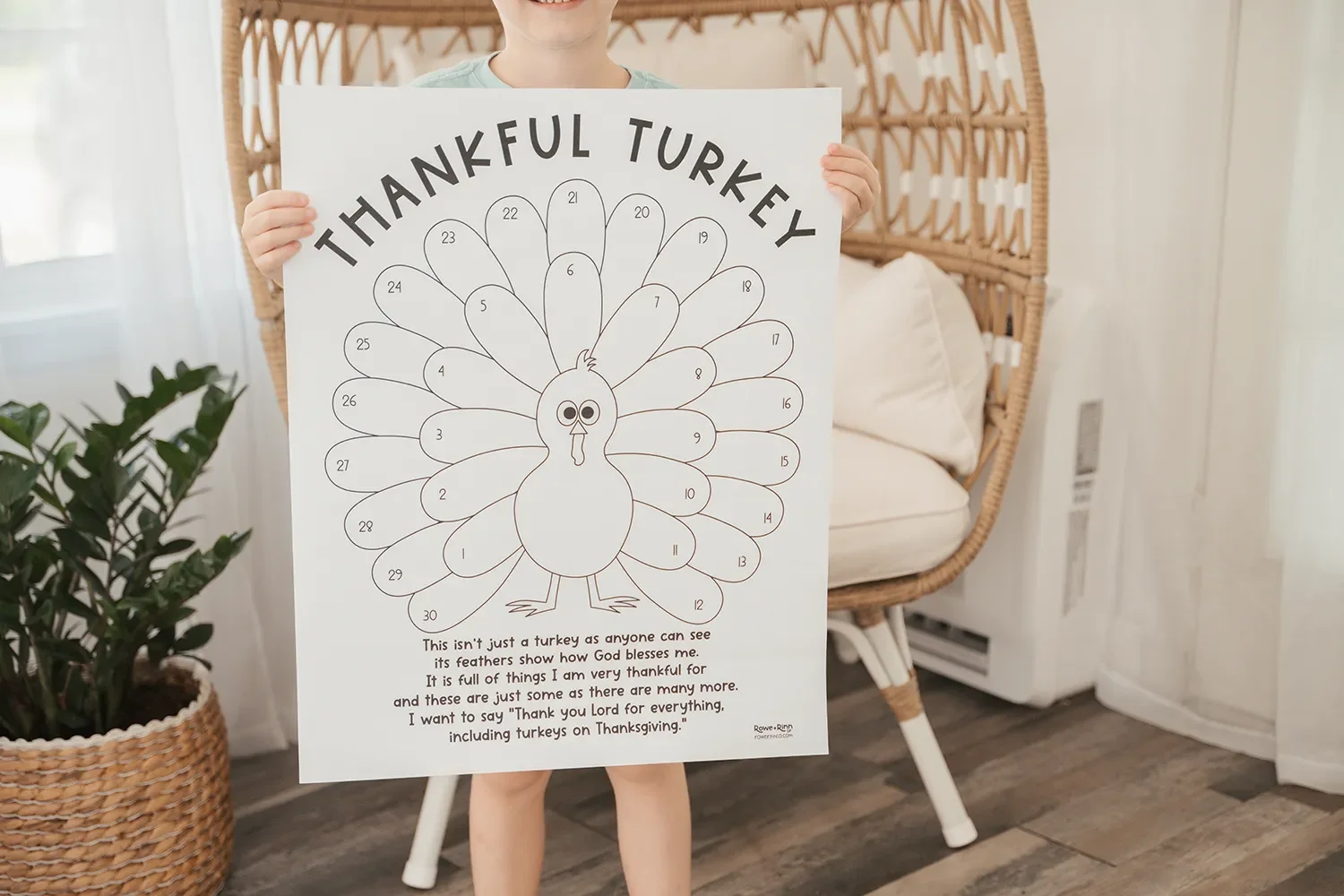 This printable is a 18x24” poster. Each day, starting on November 1, your children can color the date’s feather and write in what they’re thankful for that day. This will help them recognize their daily blessings and thank God for them! Then allow them to pray with you and thank God for what He has given them.